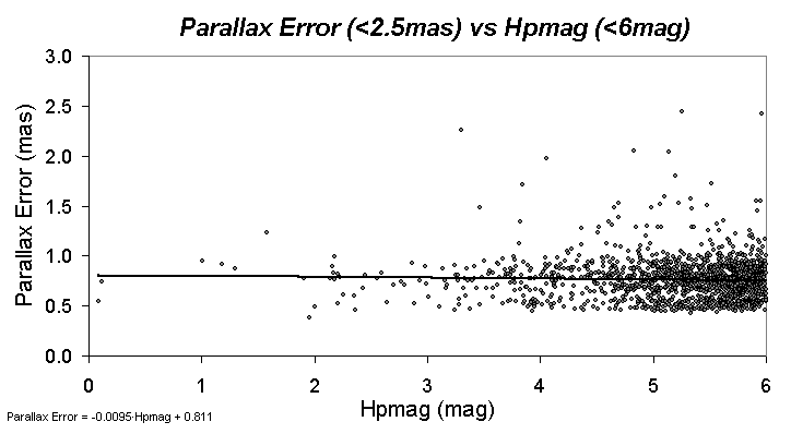 Figure 12: The error in the measured parallax against the Hipparcos magnitude for the stars fainter than V=6 selected from the Hipparcos catalogue. A significant number of stars are well off the top of this plot.