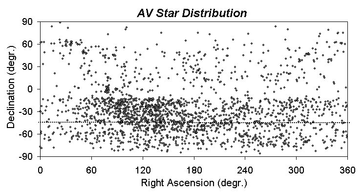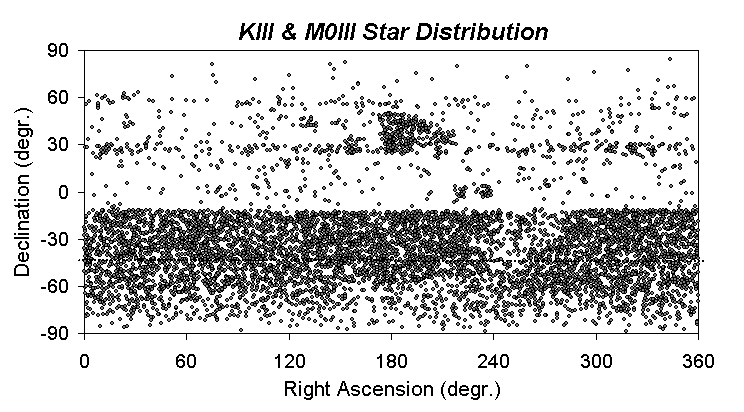 Note that some areas of the sky show significant gaps in coverage, particularly of the type AV stars. Some regions as large as 30° across are found to lack type AV stars, although the sky coverage of type KIII is more complete. In some regions of the sky it is evident that both the type KIII stars and the type AV are heavily over-sampled and that only a small fraction of the stars need be used finally.